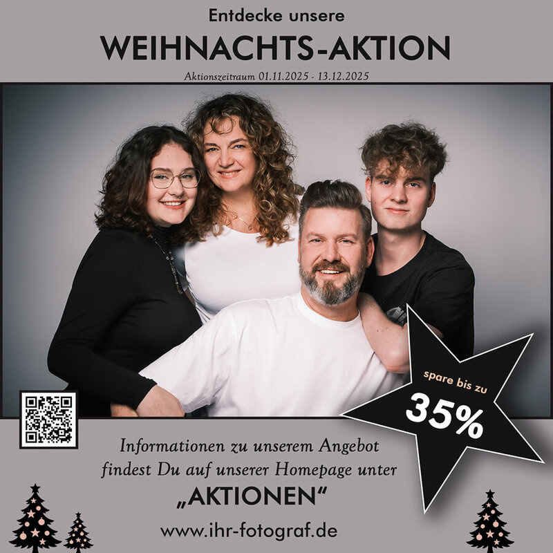 Für ein Familienshooting bucht Ihr am Besten rechtzeitig einen Termin. Das ist auch an einem Wochenende oder außerhalb der Geschäftszeiten möglich. Selten sind alle Familienmitglieder auf einem Foto und das ist bei uns natürlich möglich (auch mit Haustieren). Familienbilder sind beliebte Geschenke z.b. für die Großeltern, aber auch als Zeitdokumente sollten sie nicht unterschätzt werden. Achtet bei der Kleiderauswahl darauf, dass sie schlicht und ungemustert ist. Bringt einfach verschiedene Outfits mit und stimmt euch farblich aufeinander ab, damit es nicht zu bunt wird eignen sich Erdtöne, Pastelltöne, Grautöne, Schwarz, Weiß … Ein Shooting bei euch zu Hause oder an einem anderen ort ist natürlich auch möglich. Sprecht uns einfach an. Plant mindestens eine Stunde Für das Shooting ein. Deshalb empfehlen wir Unsere Classic oder Maxi-Serie. Hast DU Noch Fragen, diese können wir gerne bei der Terminabsprache klären.